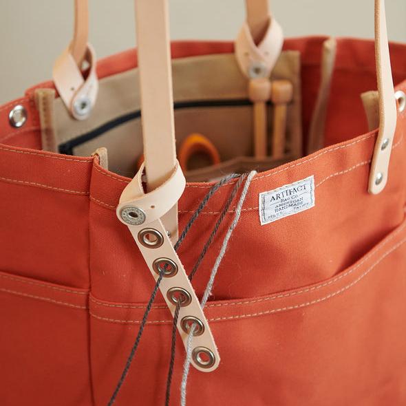 Keep your knitting and crochet work organized with our removable full grain leather yarn tender. Handmade in ARTIFACT's Omaha, NE zero waste studio.