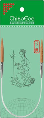 ChiaoGoo's 12″ patina, bamboo circulars have fantastic joins and pliable, clear, nylon cables. They have a nickel-plated, copper join. Needle size is permanently laser imprinted on each circular.