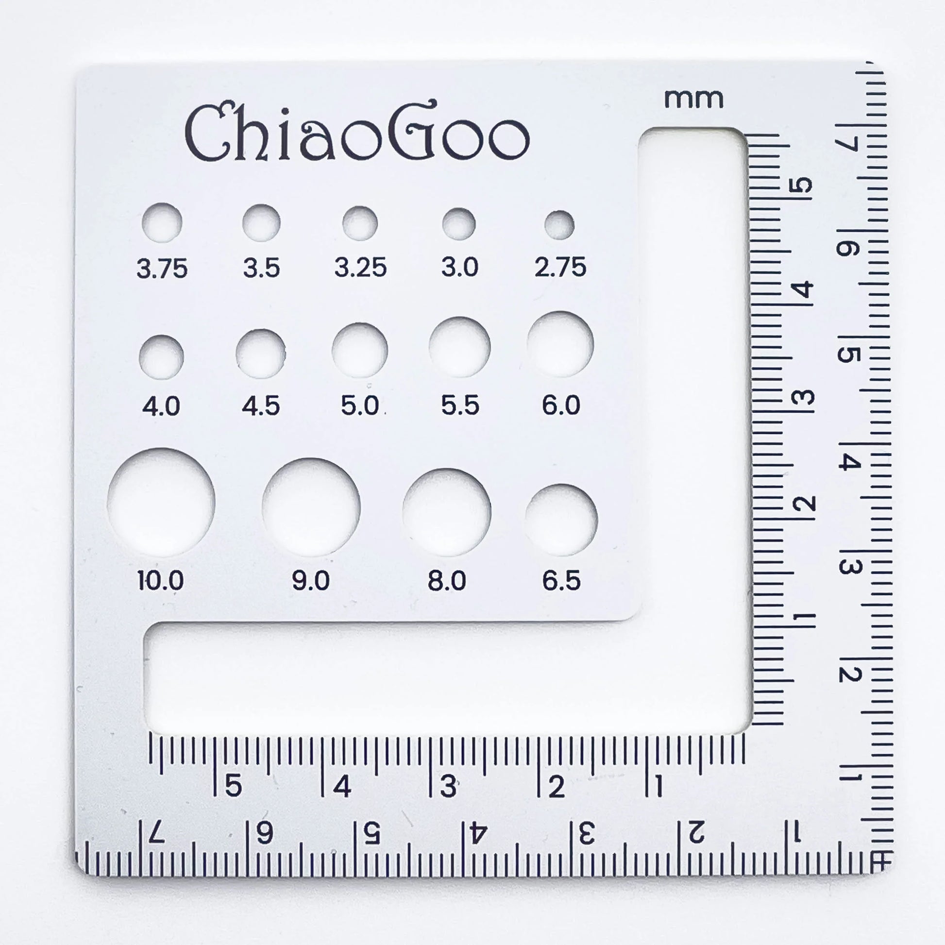 Use this sturdy, white resin, multi-purpose, laser cut needle gauge from ChiaoGoo to determine gauge and help measure your knitting needle and crochet hook sizes.