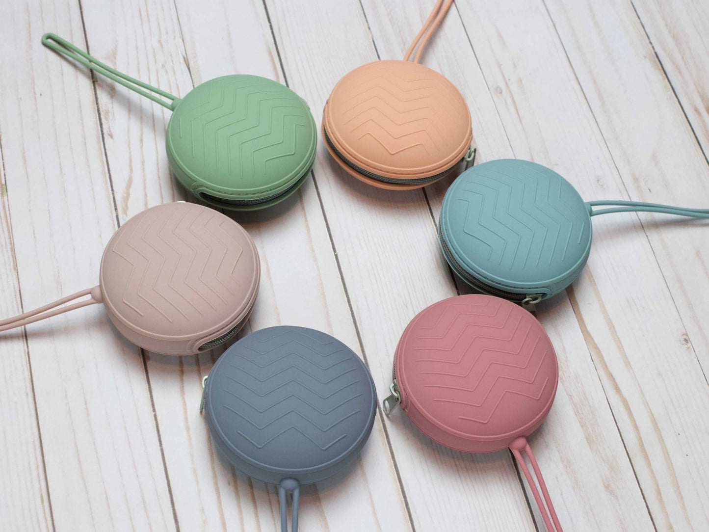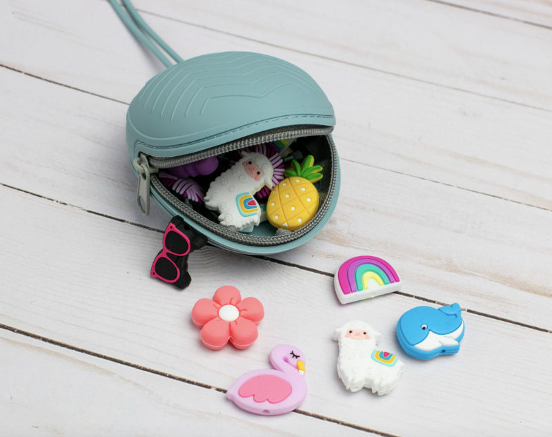 These fun round pouch bags are a great way to store your collection of stitch stoppers and knitting notions. They come in a variety of cute colors. Keep them secure in your bag with the zippered closure on the top and they can be attached to the side of your yarn bag with the loop on the bag.