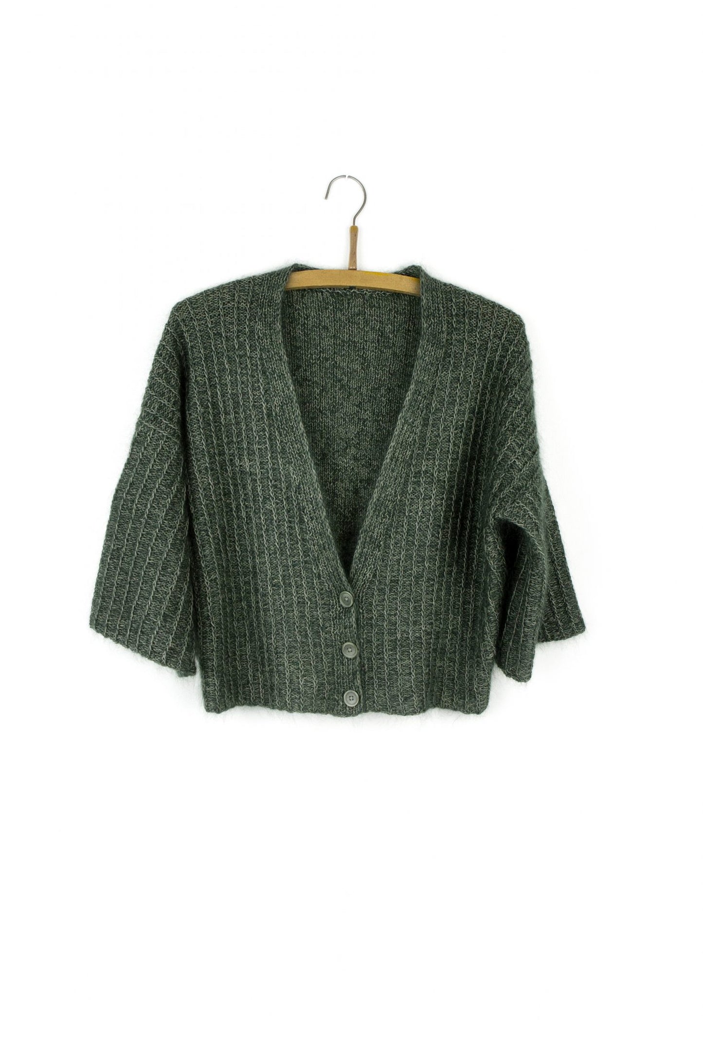 The cardigan is worked back and forth in one piece to underarms. Here work is divided into fronts and back and each part is then worked separately.
