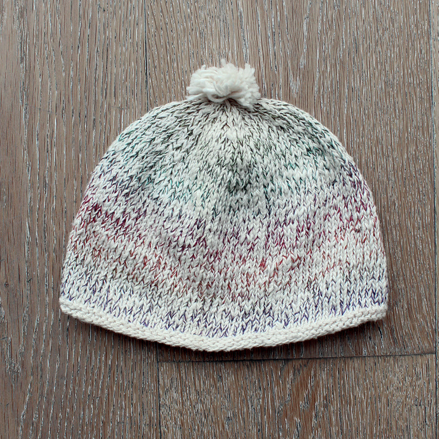The main yarn for all designs is ITO Men, an extraordinarily soft, recycled cotton yarn, which has not been treated or dyed. In contrast to the warm natural white of ITO Men, ITO Niji is a fine thread with long sequences of artfully plied colors, which is carried along to add a subtle variation and provide opportunities for composition.