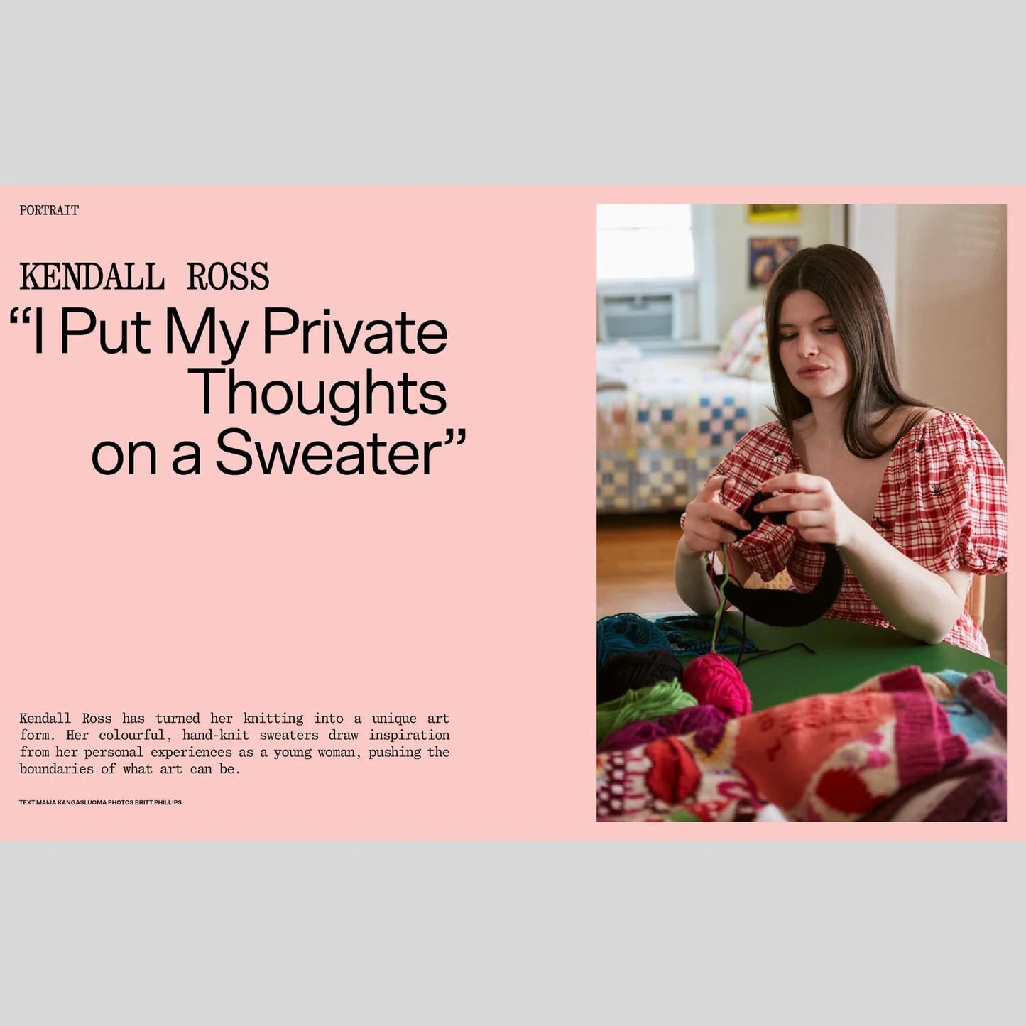 - Interview with Kendall Ross (@id.knit.that), who has turned her knitting into a unique art form. Kendall's wearable art pieces draw inspiration from her experiences as a young American woman.