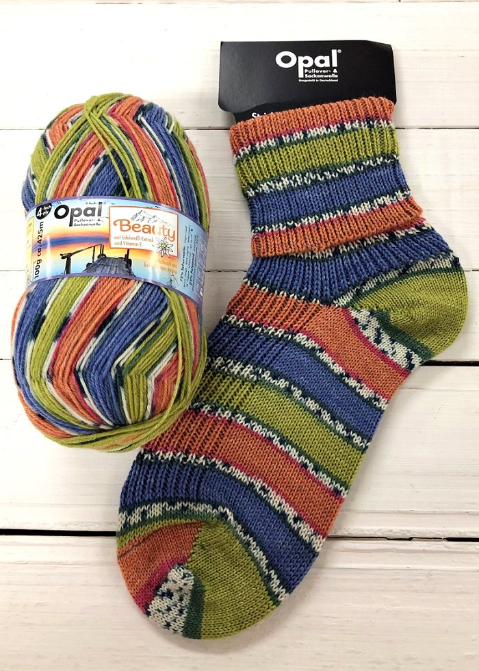 Opal Beauty Wellness 4ply with Edelweiss and Vitamin E Sock Yarn is a 4ply sock yarn made from 75% wool and 25% nylon in 6 great new self-patterning colourways. The resulting sock has excellent wearability and a luxuriously soft feel.