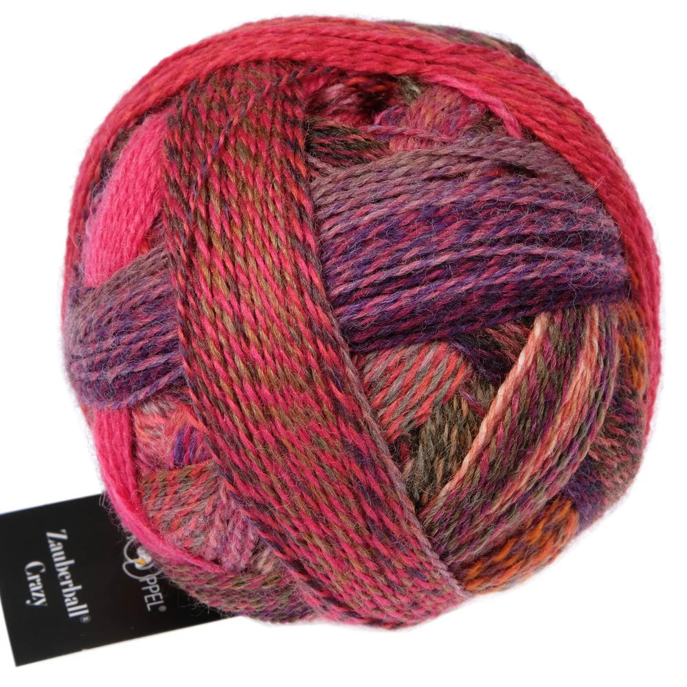 Take knit socks, shawls & accessories to the next level. Zauberball Crazy is a fingering weight, self-striping yarn that knits into bold, multi-colored designs. The yarn consists of two multi-colored strands that have been dyed individually, then plied together to create a fun, interesting knitting journey.