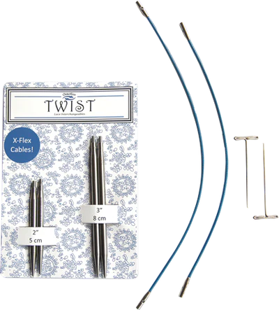 Each kit comes with one 2" (5cm) and one 3" (8cm) set of stainless steel lace needle tips, and 2 cord keys to tighten up the cable to the tip. Also included is one 5" and one 6" nylon-coated steel cable. Sizes US 000 - US 3 come with red MINI cables and sizes US 4 - US 8 come with blue X-Flex flexible cables.