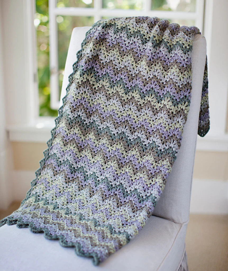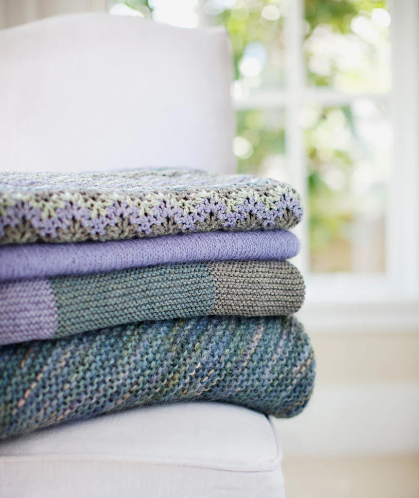 10 (15) skeins Cascade Yarns Cascade 220 (220 yds/200m each); 2 (3) skeins each of 5 colors; Throw size shown lower left and center in pale heathers 9450, 9324, 8401, 9460 ans 4011. Or approx. 1528 (2369) yds/1397 (2166)m of worsted-weight yarn.